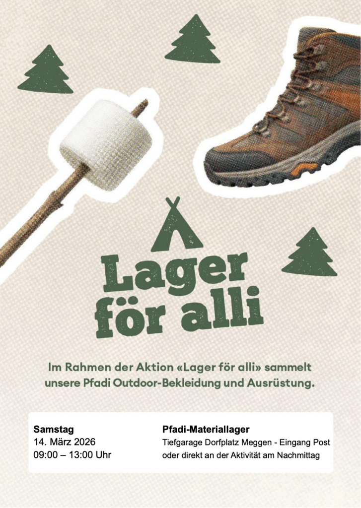 Am Samstag, 14. März 2026 ist deine Chance! Denn an diesem Samstag öffnen in der ganze Schweiz die Pfadis ihre Pforten und zeigen die spannende Welt der Abenteuer und Fantasie. Wenn du also kein Mitglied der Pfadi Meggen bist, laden wir dich herzlich dazu ein, mit uns an diesem Tag ein riesiges Abenteuer zu erleben 🥳.