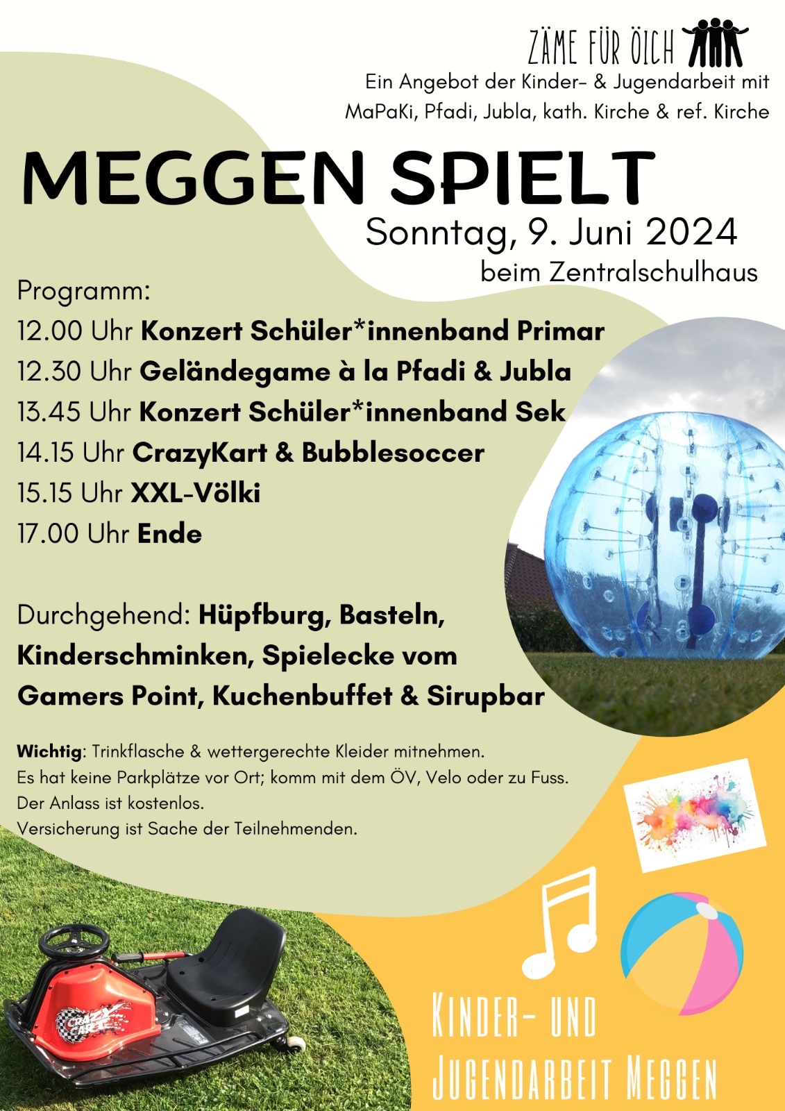 Wir treffen uns alle gemeinsam beim Zentralschulhaus und erleben einen aufregenden Tag mit Schülerband, Geländegame, Hüpfburg, Buffet und noch ganz viel mehr.